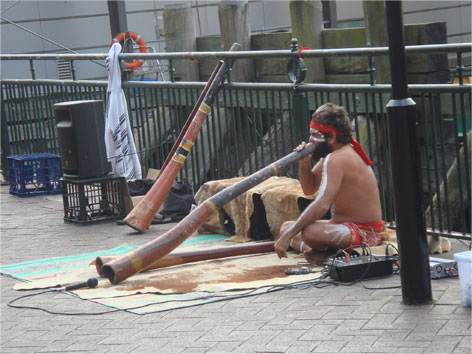 オペラハウスやハーバーブリッジは後回しですが、アボリジニの存在は素通りできず。サーキュラ・キーで現代のアボリジニが生演奏してました。ハイテク機器を駆使して。冬にこの格好で。さすがだ。